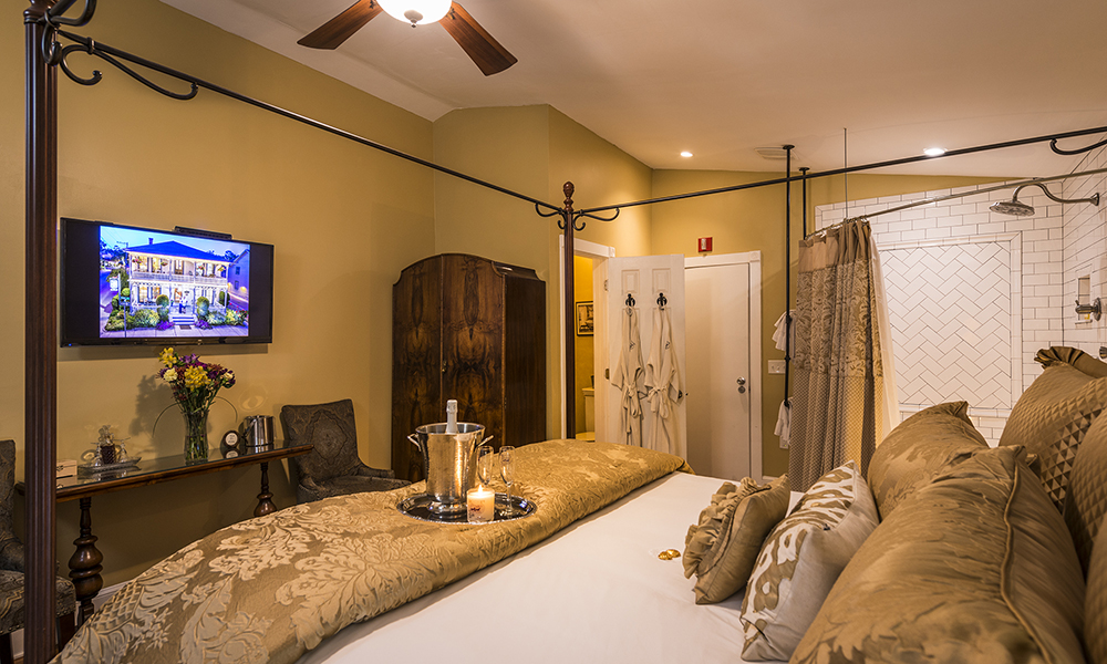The newly renovated "Industrial Chic" Carriage Way Cottage is the perfect choice for three couples traveling together. The inn's most luxurious guest room, the Premium Diamond Suite, features a king bed, plus living and dining areas, a kitchenette with a microwave and mini-fridge, and an en-suite with both an air-jet tub for two and a combination rain head shower and dual body sprays.