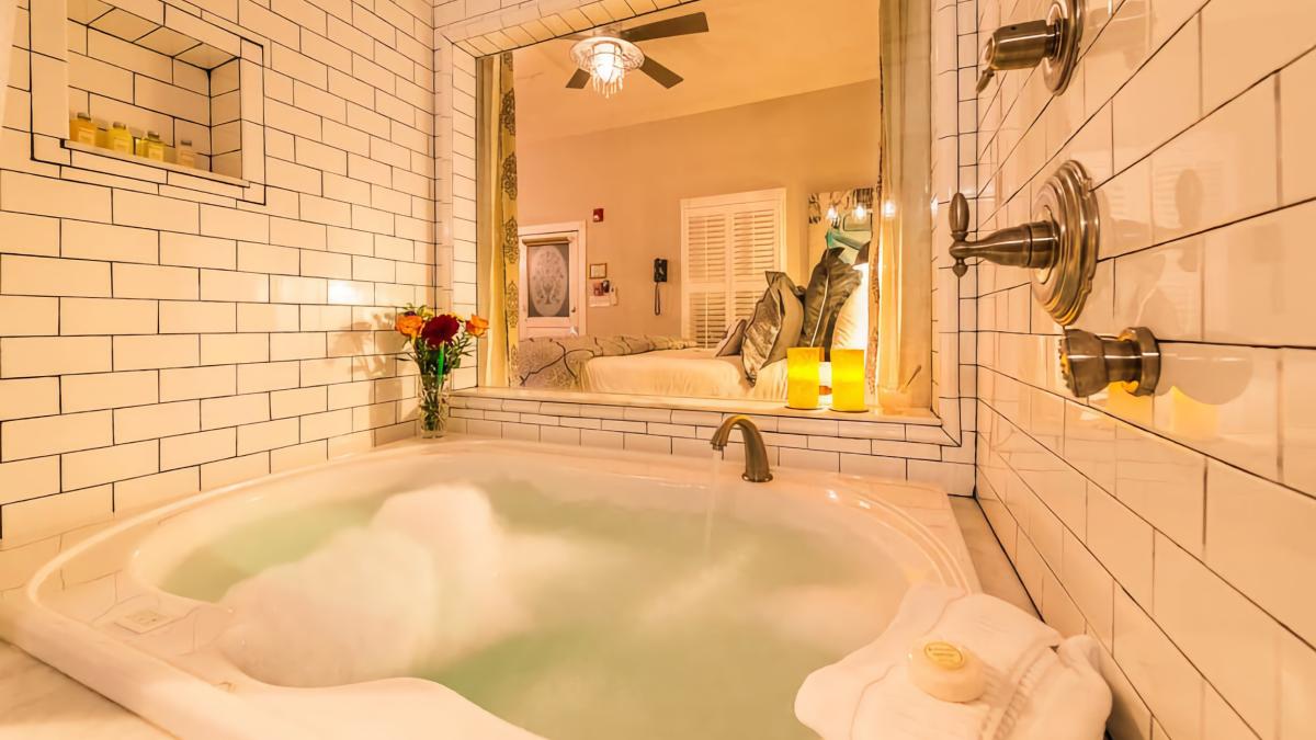 Set in a beautifully restored Victorian home, Carriage Way Bed & Breakfast offers historic elegance and southern comfort. Each uniquely themed room features luxurious amenities (just like the tub in the title image) and complementary beverages to make your stay comfortable.