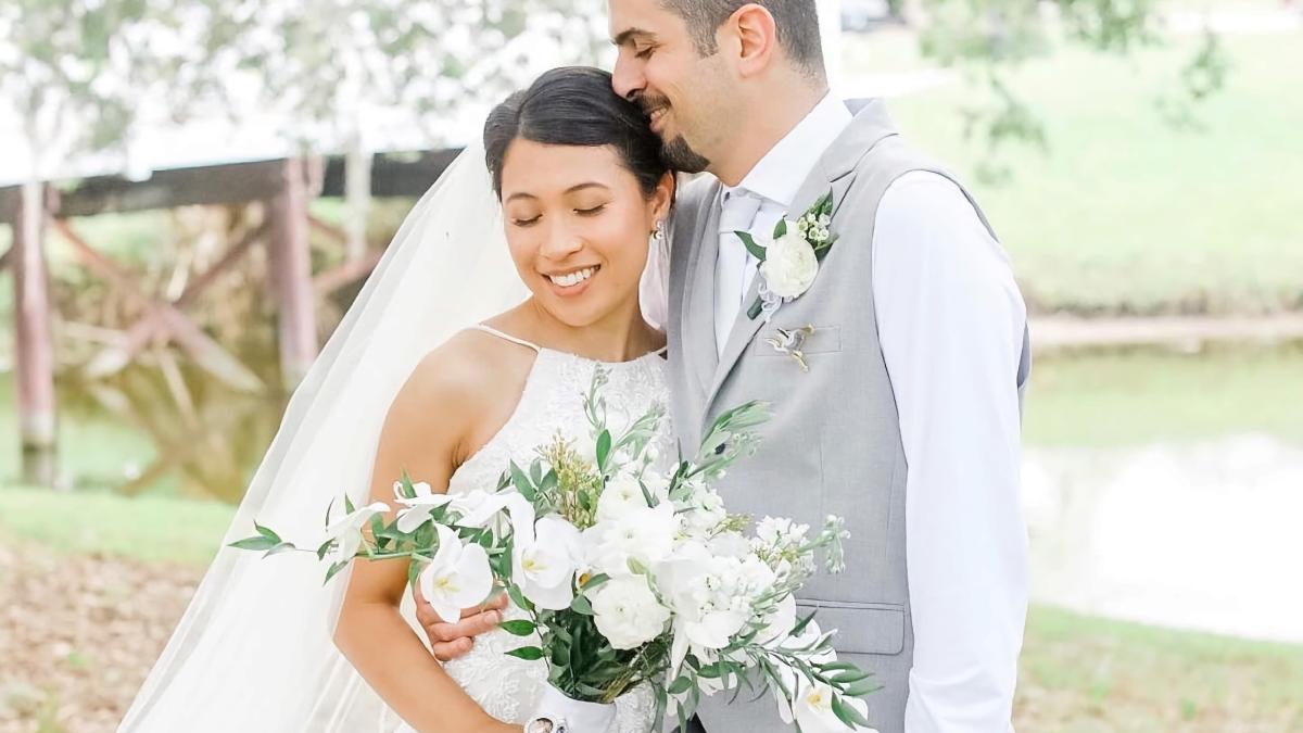 The bridal couple here has a bouquet and boutonniere from Art Among the Flowers.