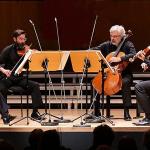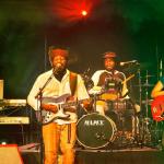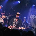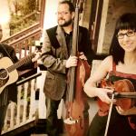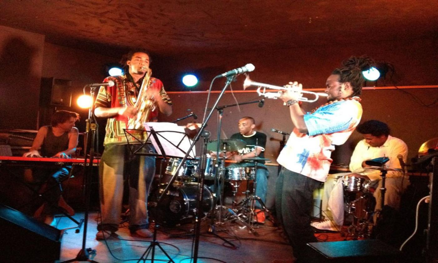 Three musicians, a bass player, harmonica player, and guitarist performing together at an open mic