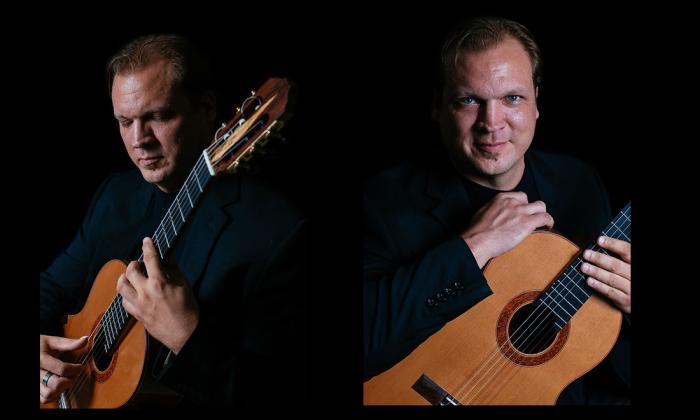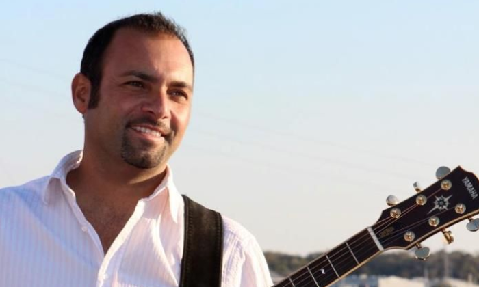 Singer and songwriter Denny Blue performing with guitar and harmonica. Courtesy of Terry Bottom