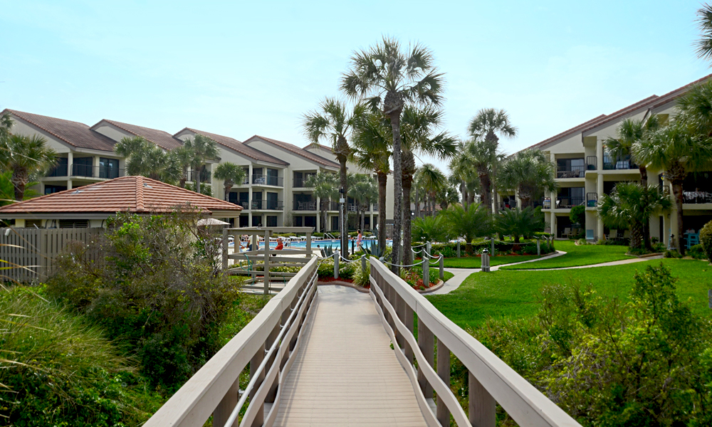 There are two complexes on the property, the Vistas and the Villages. The Vistas are ocean-view condos, offering a beautiful view of the beach and dunes from the first, second, and third stories. The Villages are also three stories and feature both lake and garden views. All have access to the beach and all the amenities on the property.