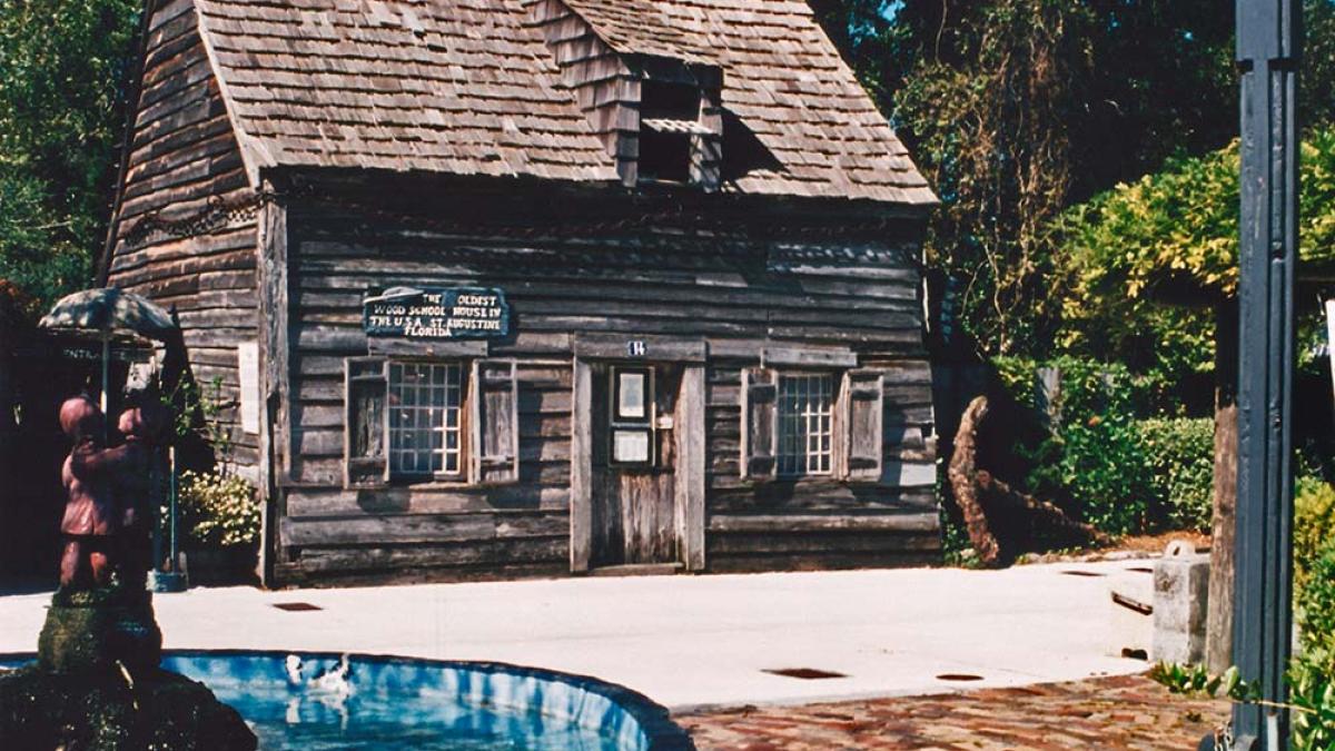 No wooden structures in St. Augustine built prior to the year 1702 still stand because the British burned Spanish St. Augustine to the ground in that year. Tax records indicate that the wooden school house was present in 1716 and was built for the Genoply family. Located in the "Minorcan Quarter," the original structure was a one-room, single-story building with a detached kitchen where food was made for the family to eat. Kitchens were commonly detached in those times to keep the house cool during the hot summer months and to prevent a fire that started in the kitchen from spreading to the house. A privy with a privacy wall was also kept away from the house, and so was the well. The house's exterior was made out of bald cypress and red cedar logs bound together by wood pins and iron spikes, all made by hand.