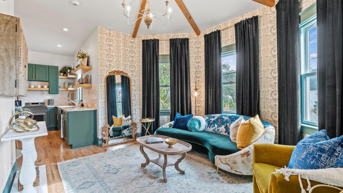 On the third floor, the interior of the two-bedroom "Epilogue" is decorated in muted greys and whites with pops of color in the living room and one of the bedrooms. In the second bedroom, a charming ceiling under the eaves is covered in wallpaper clouds. Both bedrooms have a private bath. This apartment would be perfect for two couples on a memorable St. Augustine vacation.