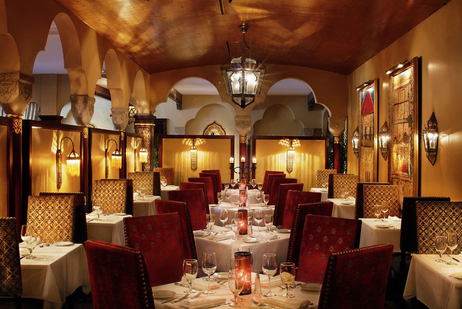 The Casa Monica was built by Franklin Smith, who also built the Villa Zorayda just down the street and had a deep admiration for Moorish and Spanish Revival architecture. Even though the hotel has changed a lot since its heyday, you can see the influence of Franklin Smith's Middle Eastern style throughout the interior, in the archways, and other details. Tina Guarano Davis was commissioned to hand-paint the trimmings and decor in the main lobby, the Cordova Room, the Flagler Ballroom, and the guestroom corridors. Moorish design is known for its elaborate ornamentation, striking colors, and rhythic patterns, so the floral and geometric designs brought an authentic flair to the resort's woodwork. The Gold Room features hand-painted gold leaf across the room's ceiling, designed to reflect the light from the handmade Moroccan chandeliers.
