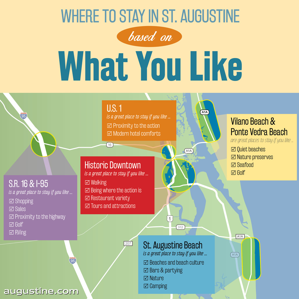 As the above infographic shows, there are several distinct lodging areas in St. Augustine, each of which has its own character and benefits. How do you choose which region is right for you? Once again, you can't go wrong if you base your choice on your personality.