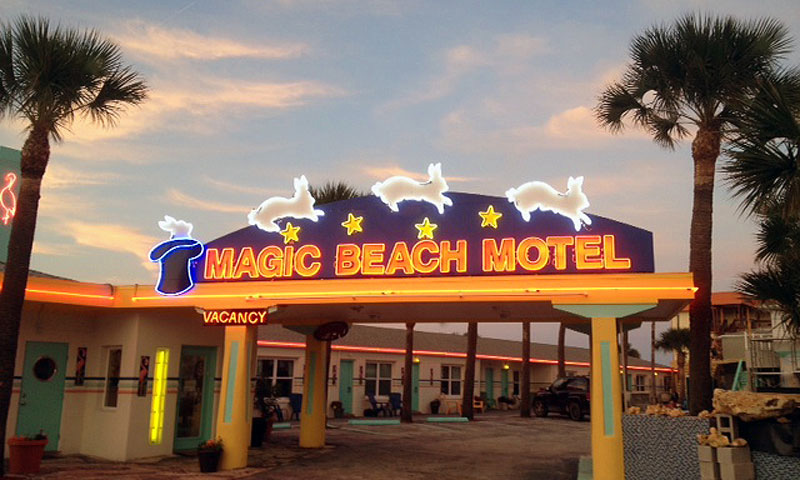 The Magic Beach Motel is pure Florida Art Deco, from its iconic neon signs and pink flamingos to the hand-painted murals in each room -- portraits of Ponce de Leon, tropical beach scenes, images of old St. Augustine, most of them original or lovingly restored.